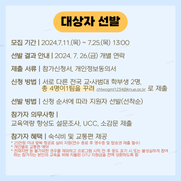 한국교원대학교 GTU사업단에서 국내 글로벌 다문화 교육연수 “多같이 GO – 다문화 교육을 위한 협력 캠프” 참가자를 모집합니다.