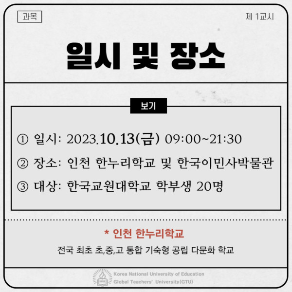 한국교원대 GTU사업단에서는 다문화 교육 정책 학교인 인천 한누리 학교와 한국이민사박물관을 방문하여