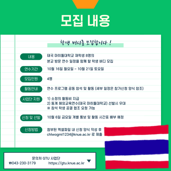 태국 마히돌대학교 본교 방문연수 실시에 따라 연수 일정을 함께할 우리학교 학생버디를 아래와 같이 모집하오니,