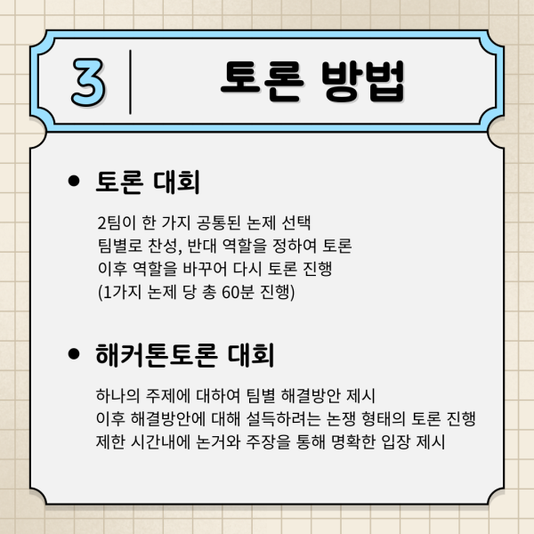 - 1일차 : 2팀이 한 가지 공통된 논제를 선택, 팀별로 찬성․반대의 역할을 정하여 토론하며, 이후 역할을 바꾸어 다시 토론