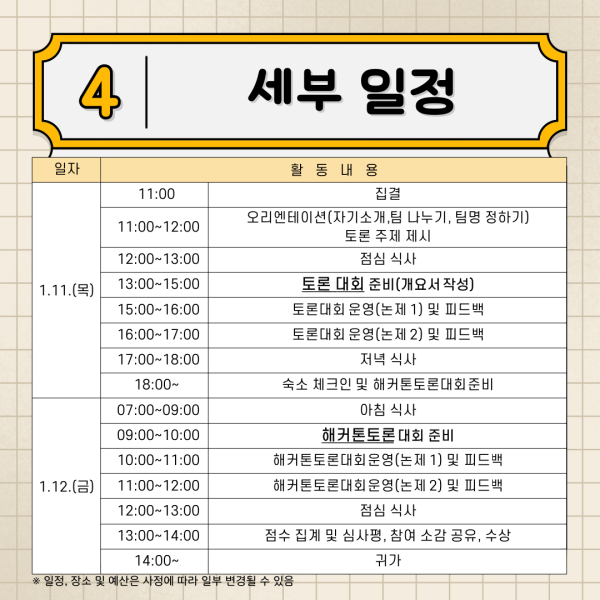 - 2일차 : 하나의 주제에 대하여 팀별로 해결방안을 설명하고 설득하려는 논쟁 형태의 토론으로 제한시간내에 논거와 주장을 통해 명확한 입장 제시