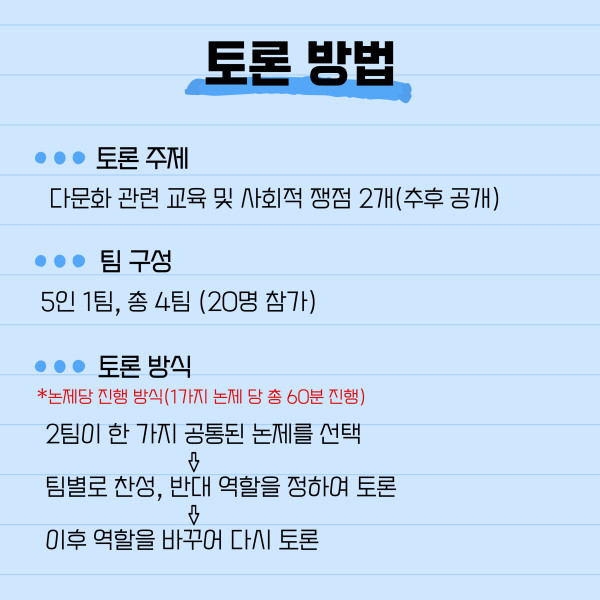 ❍ 토론 주제 : 다문화 관련 교육 및 사회적 쟁점 2개(추후 공개)