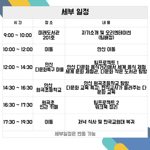 한국교원대 GTU사업단에서는 국내 외국인 밀집지역인 안산을 방문하여 안산 다문화 마을 특구와 안산 원곡초등학교를 방문하여 국내 글로벌·다문화 교육연수(안산:현장에서 배우는 다문화교육)을 진행하려고 합니다.