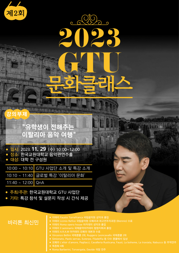 - 내용 : 글로벌 특강 "유학생이 전해주는 이탈리아 음악 여행"(2회차)